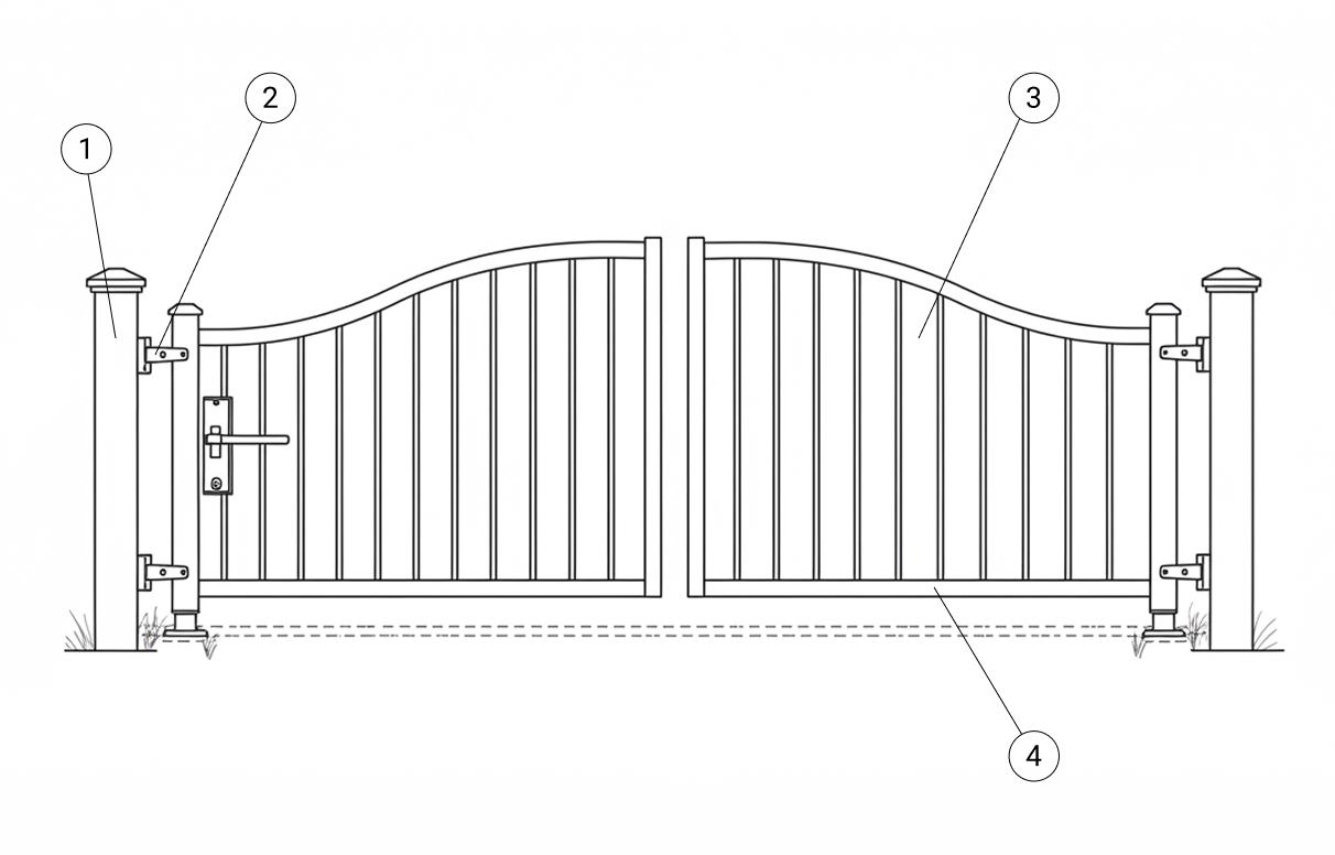 Изделия выполняют из каркаса, столбов, и наполняют створки выбранным заказчиком материалом. Каркас создан из трубы прямоугольной или квадратной. Для столбов подходит профиль 100х100 мм или 80х80 мм.